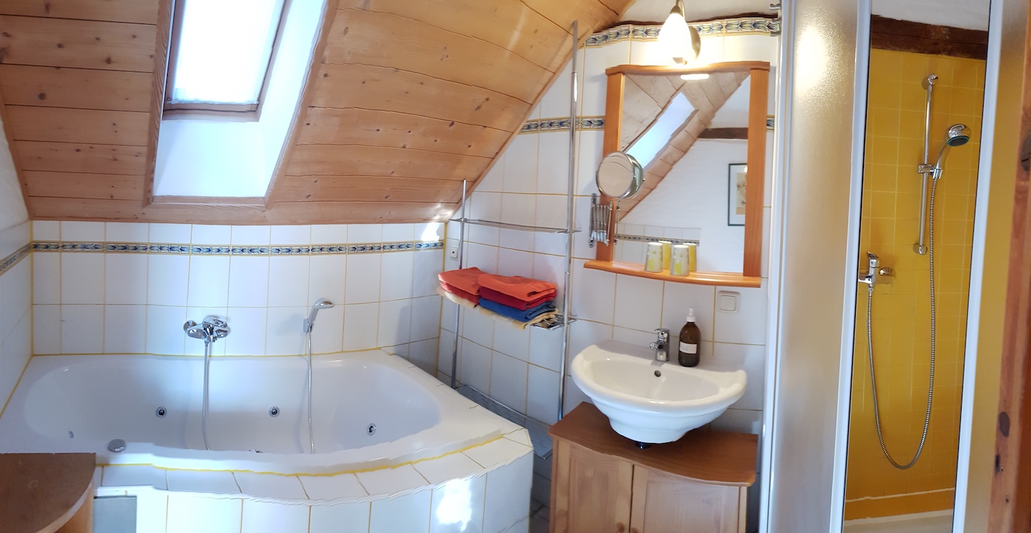Bad mit Whirlwanne, Dusche und Waschbecken